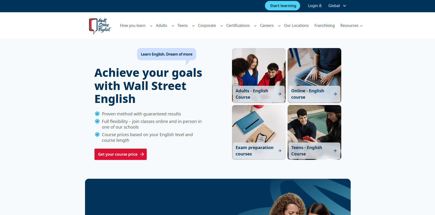 Wall Street English to szkoła języka angielskiego oferująca zajęcia online na żywo, stacjonarne oraz w modelu hybrydowym. Działa w oparciu o metodę Blended Learning, która łączy materiały wideo, ćwiczenia interaktywne i wsparcie nauczyciela.