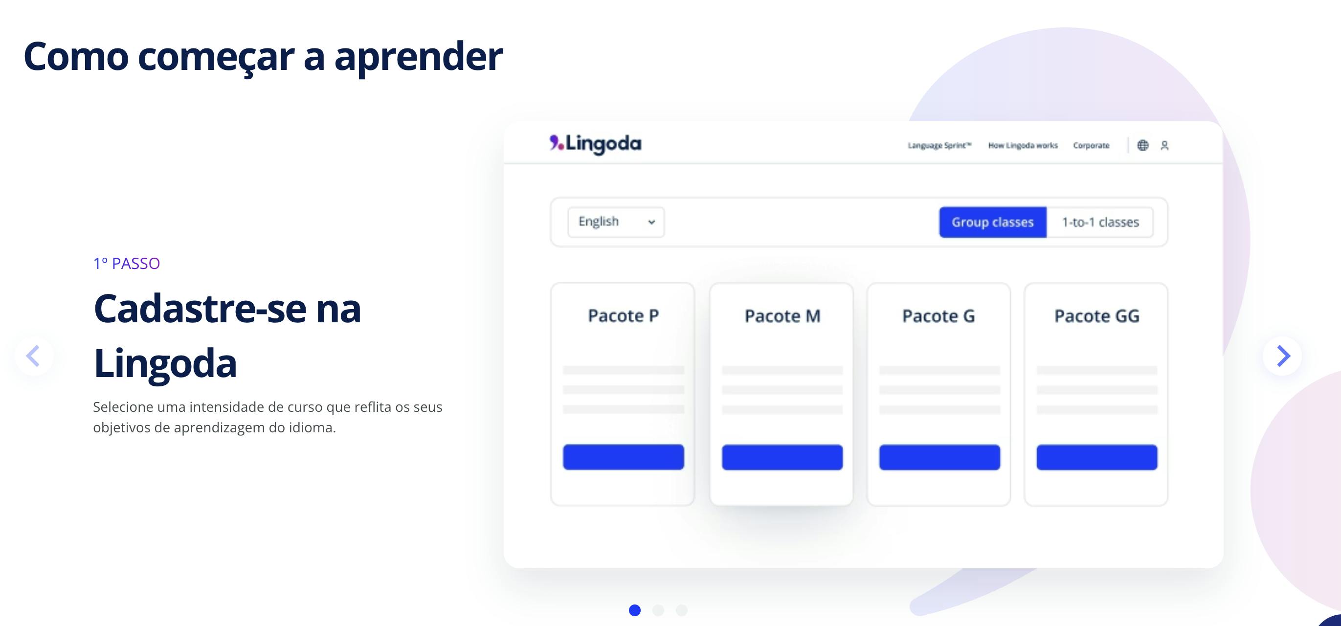 Ao entrar, a primeira coisa que você verá será um anúncio pedindo para você escolher seu plano para começar a aproveitar o curso e escolher entre aulas em grupo ou particulares.