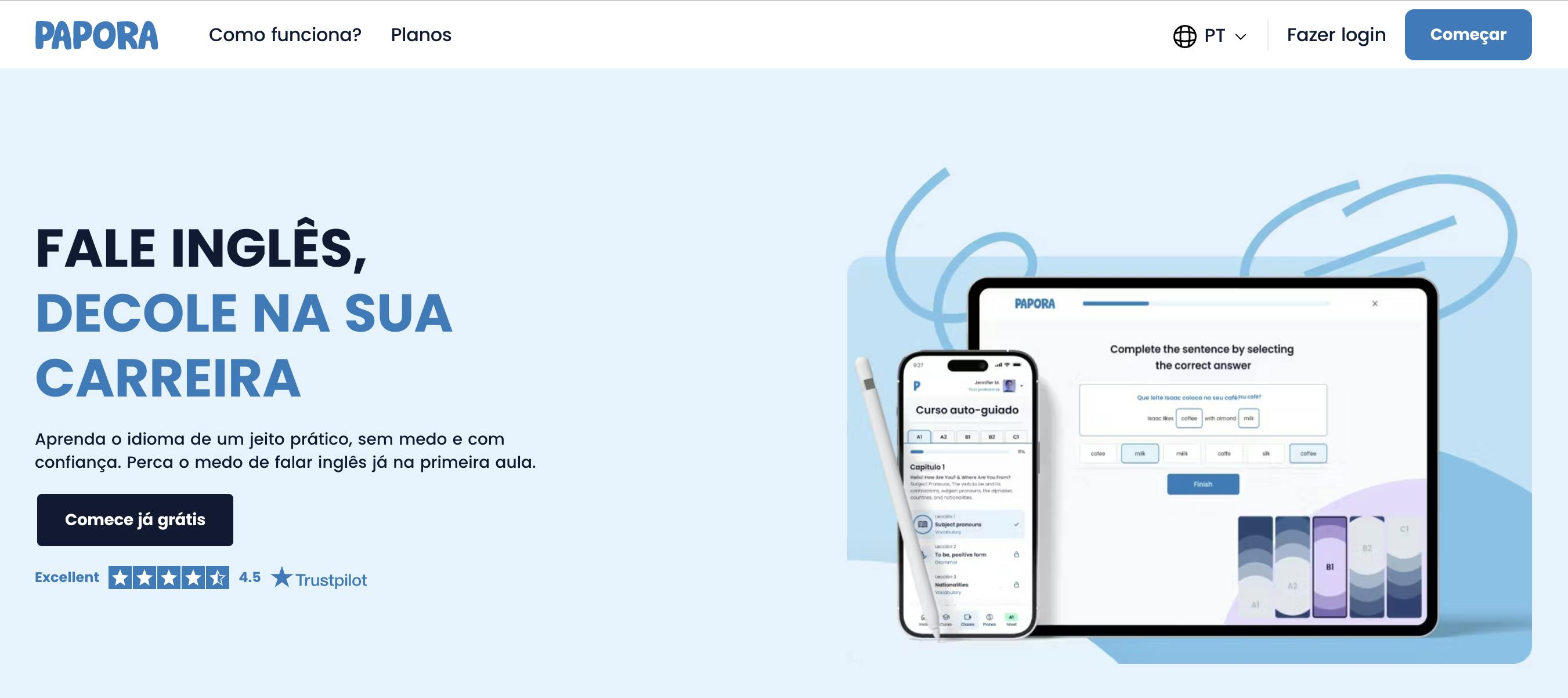 Papora oferece aulas dinâmicas e divertidas onde você melhorará cada área do inglês em pouco tempo. Aprenda no seu ritmo e sem pressões