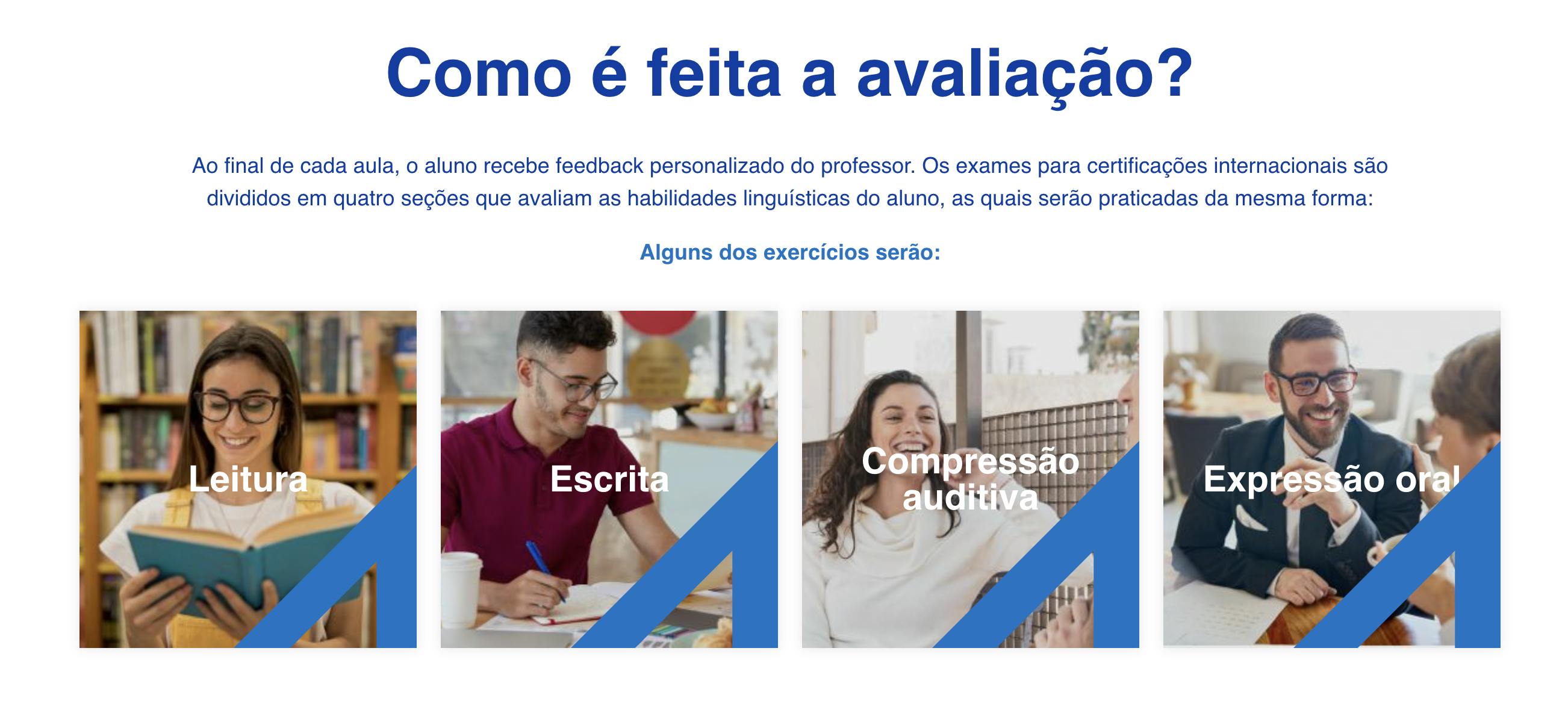 Oferecem cursos desde os níveis mais básicos (Iniciante A1) até os mais complexos (Avançado C2). Cada nível é dividido em uma quantidade específica de horas que, após completadas, são avaliadas com a apresentação de um exame escrito e outro oral.