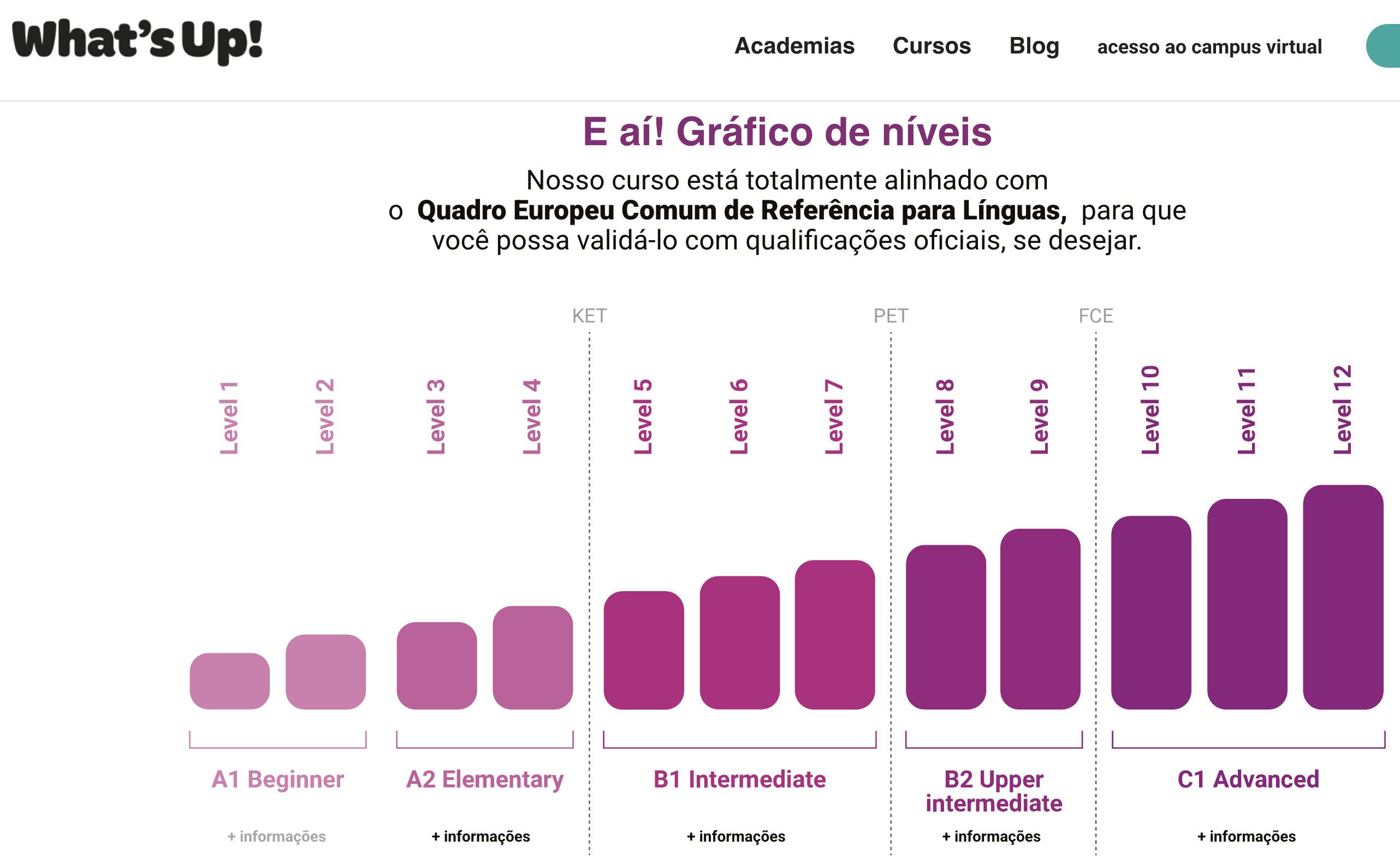 Essa escola de inglês é orientada pelo Quadro Europeu Comum de Referência para Idiomas, que vai do nível básico ao avançado, catalogado por letras de A a C. O "What's Up!" propõe ensinar em cada nível sobre conversação, compreensão auditiva, conversação e redação.