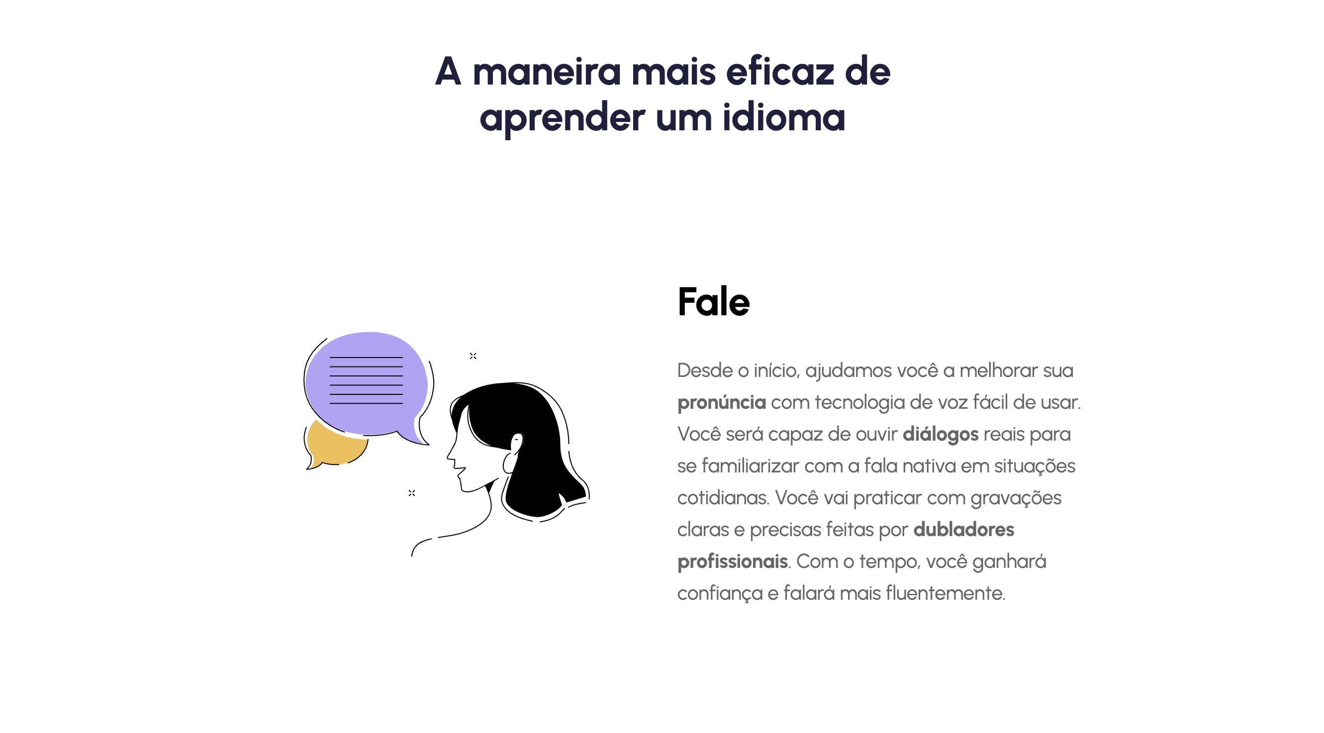Oferecemos aulas ilimitadas por mês, em grupos reduzidos, com foco em ajudar você a melhorar sua pronúncia e ganhar confiança ao falar. Além disso, um curso autoguiado com mais de 300 lições interativas. Assim, você pode estudar 24 horas por dia.