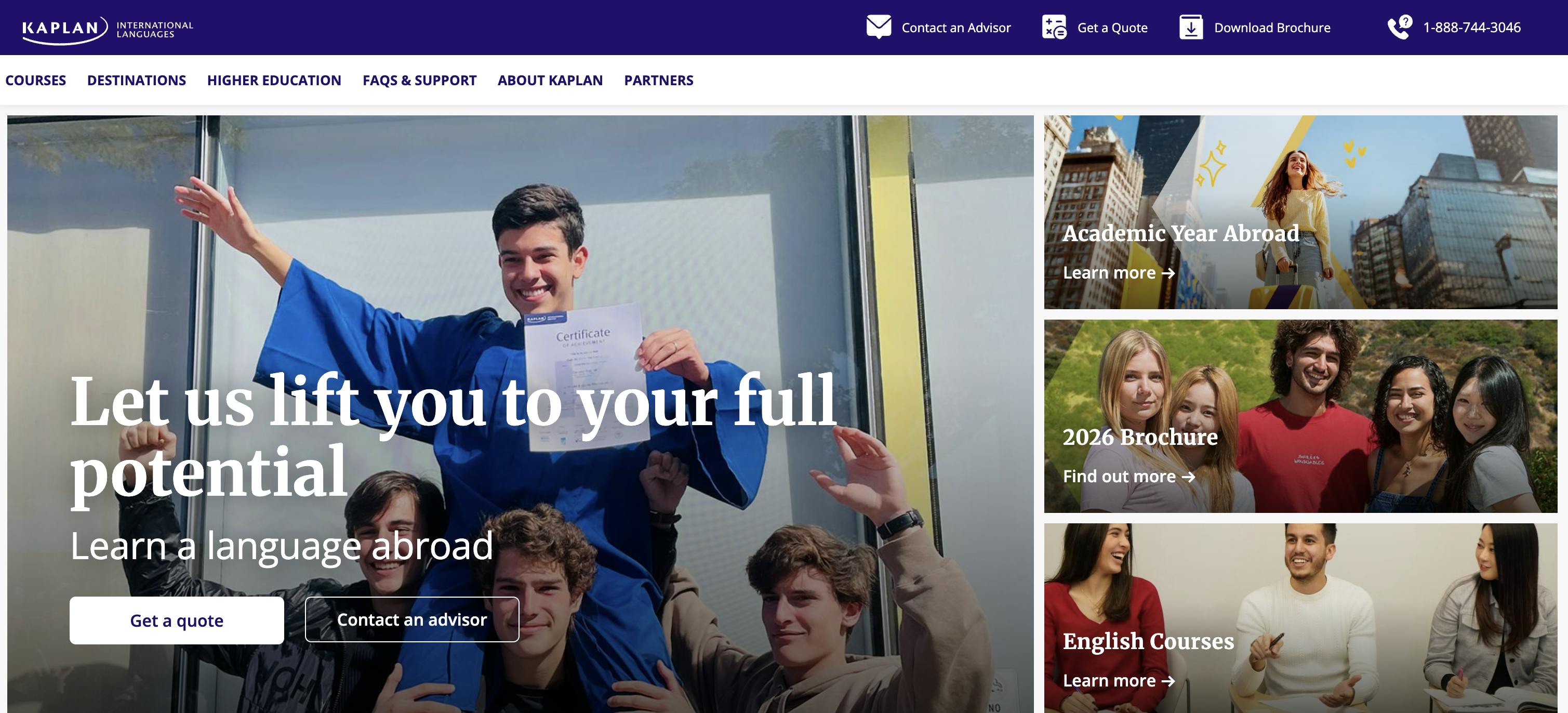 Com mais de 80 anos de experiência, Kaplan é uma academia de idiomas que conta com escolas em mais de 7 países do mundo e sua principal premissa é o aprendizado por imersão com comunidade nativa em cidades dos Estados Unidos, Reino Unido e outros, embora também conte com um programa online.