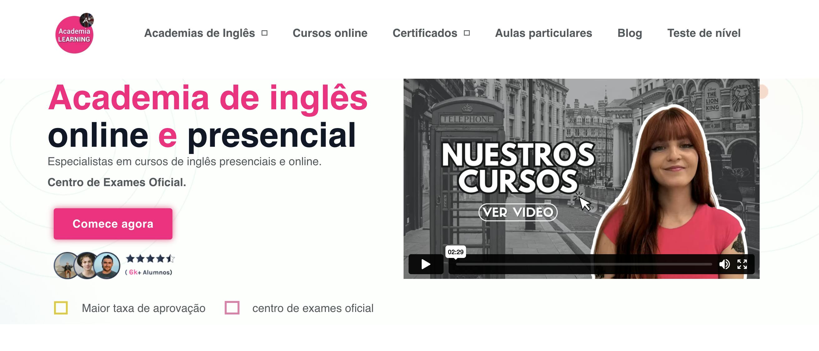 Com modalidades presenciais e online, a Academia Learning oferece a seus estudantes a possibilidade de aprender o idioma com aulas de inglês em grupos com professores de confiança e em horários "flexíveis". Possui múltiplas certificações.
