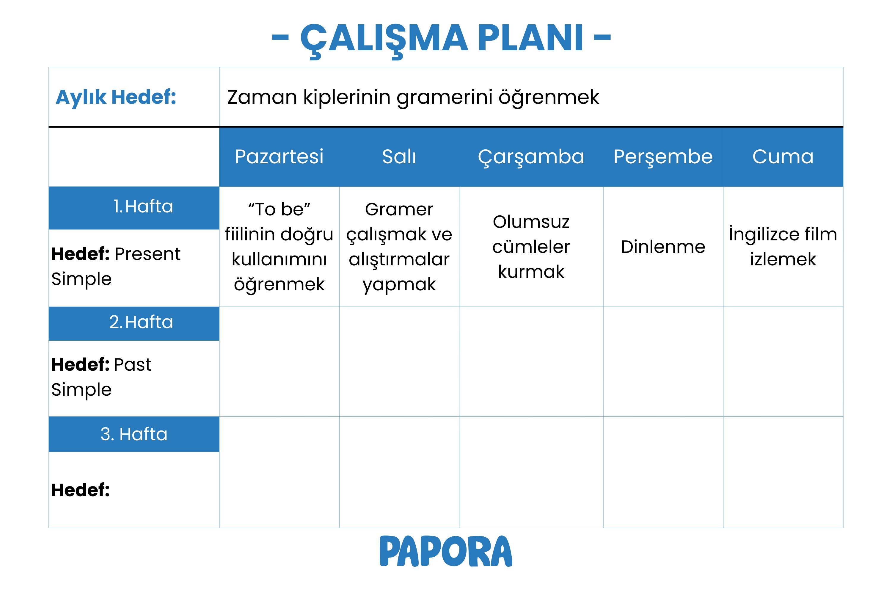 📌 Örneğin, 1. hafta için to be fiilinin olumsuz hali, harfler ve sayılar üzerinde çalışmaya odaklanabilirsiniz ve 2. hafta için selamlaşma gramerini öğrenmeye odaklanabilirsiniz.