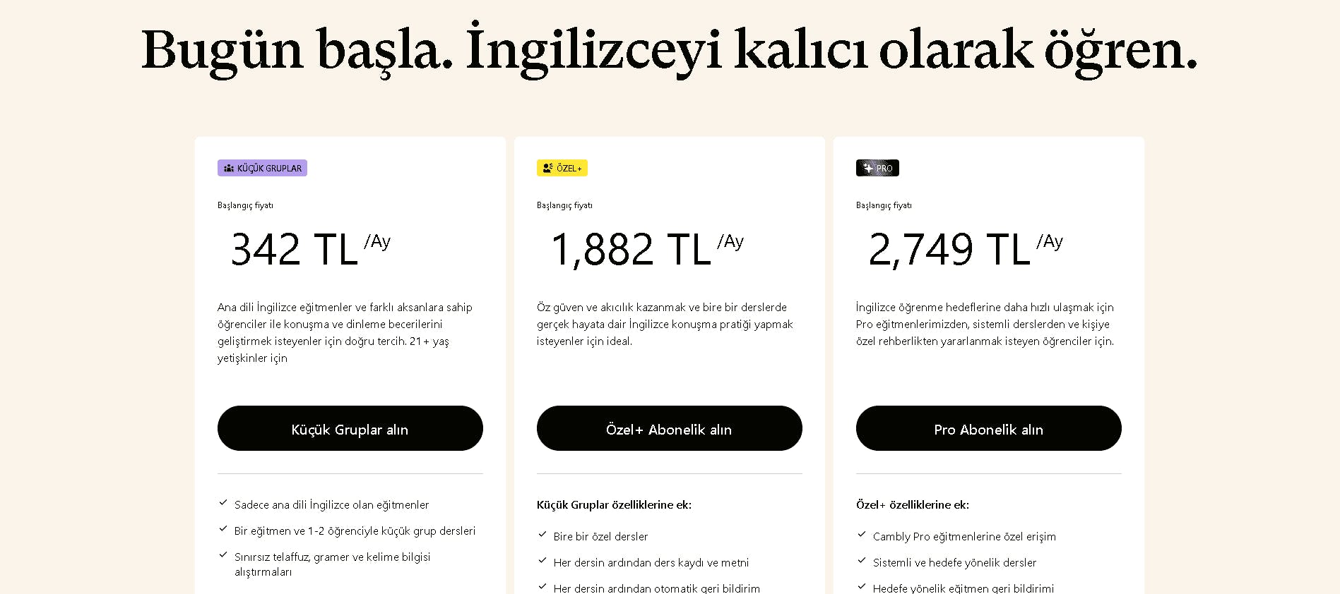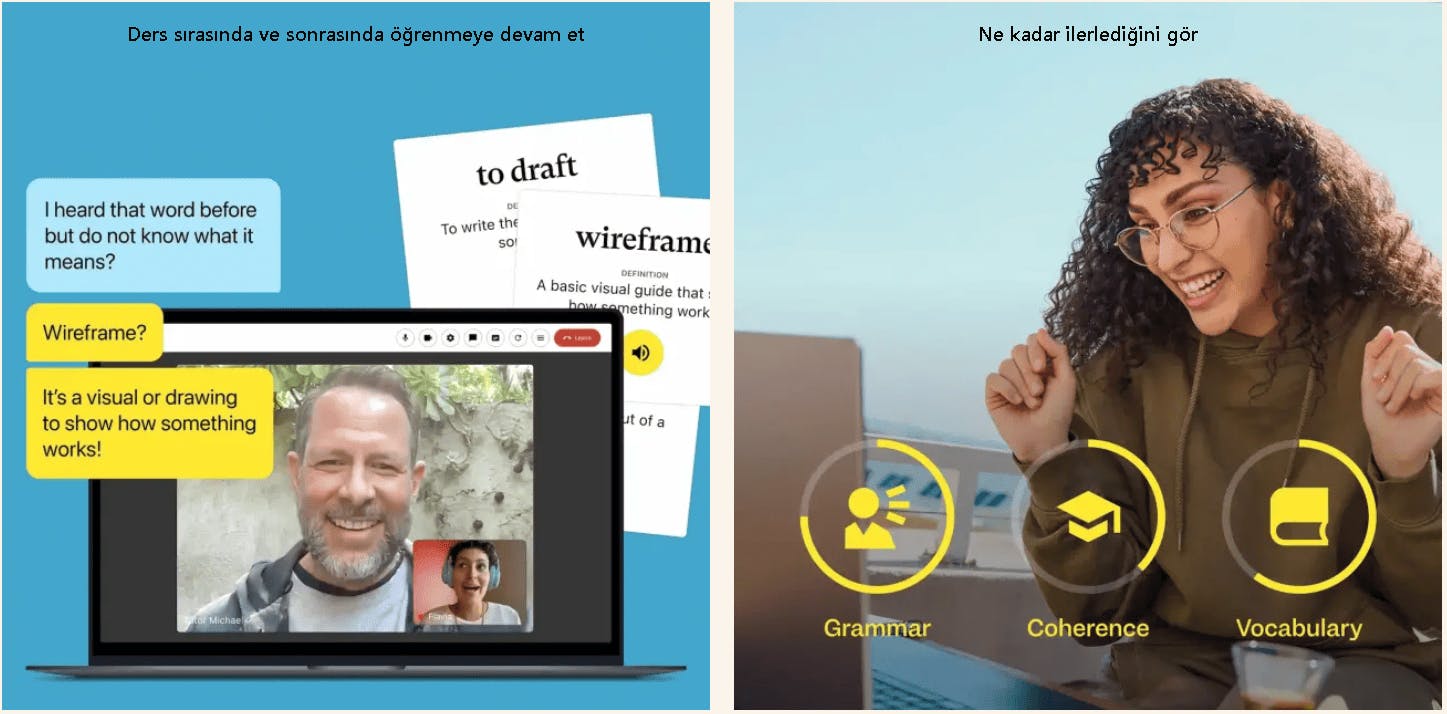 | Esnek çalışma saatleri: Öğretmenlere göre ders saatlerini seçebilirsin, böylece dersleri günlük rutinine uyarlayabilirsin. | Yüksek hizmet maliyeti: Diğer kurslardan daha pahalıdır ve çok daha uygun fiyatlara daha kapsamlı seçenekler mevcuttur. |