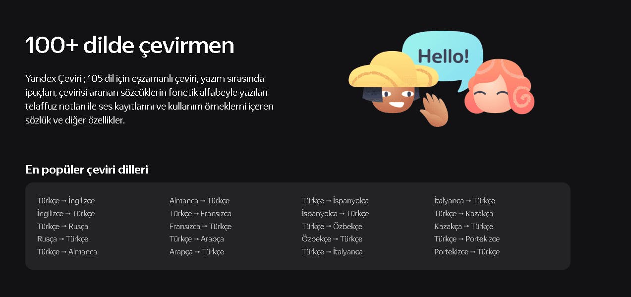 Yandex Translate'in en iyi özellikleri arasında, internet bağlantısı olmadan her türlü metni ve fotoğrafı çevirebilmesi sayılabilir. Ayrıca, 100'den fazla dilde çeviri yapma özelliğine sahiptir.