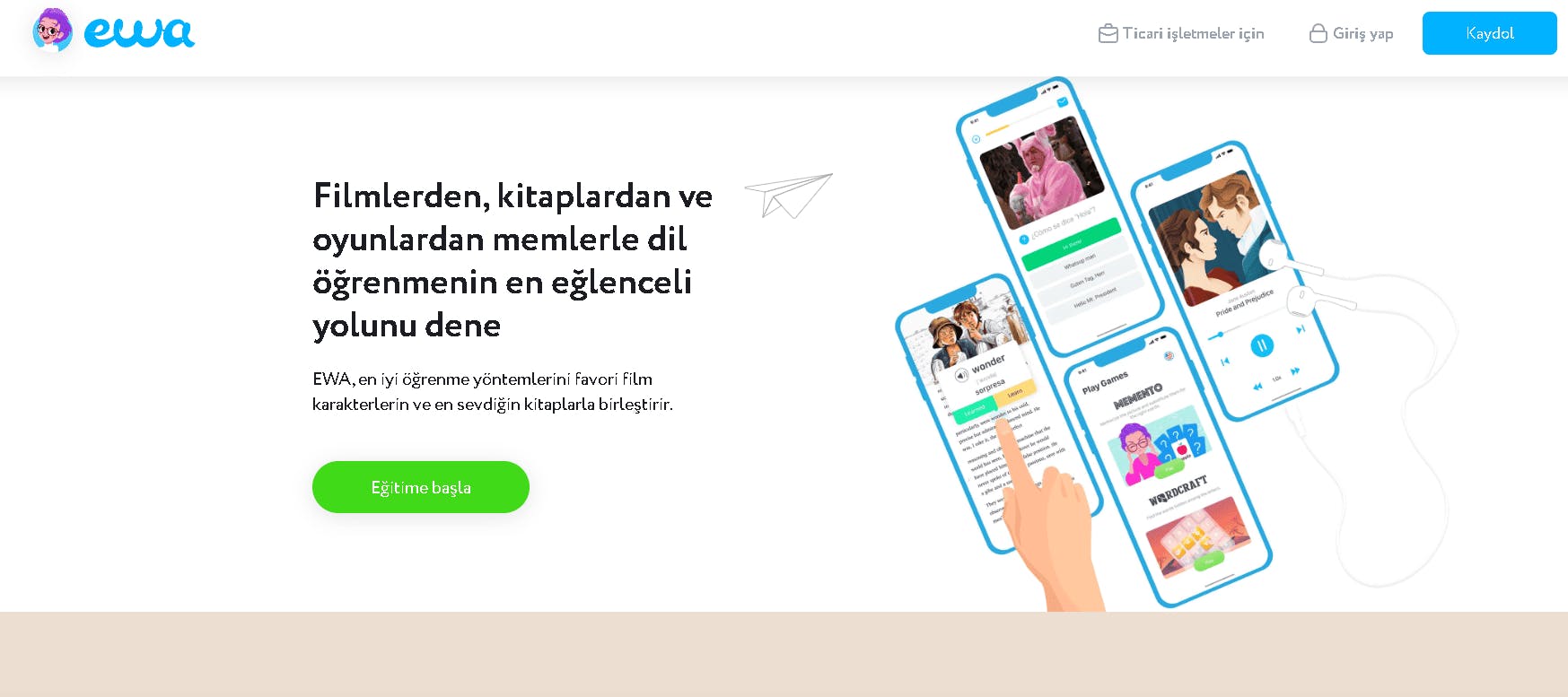 Ewa, mobil cihazlara özel bir İngilizce öğrenme uygulamasıdır ve dil öğretimini filmler, eğlenceli karakterler ve kitaplar gibi içeriklerle birleştirmeyi vaat etmektedir.