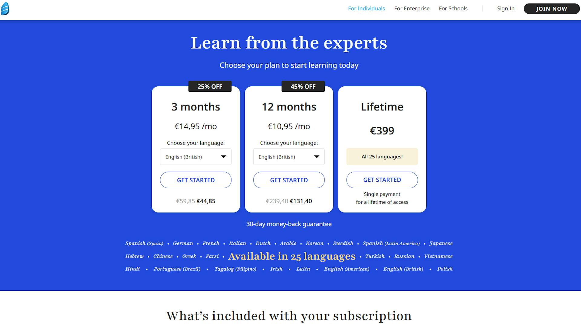 Rosetta Stone’un sunduklarının aksine, bu online platformda ayda sınırsız ders alacak, küçük gruplarla çalışacak ve uygun olduğunuz saatlere göre geniş ders saatleri yelpazesinden faydalanabileceksiniz.