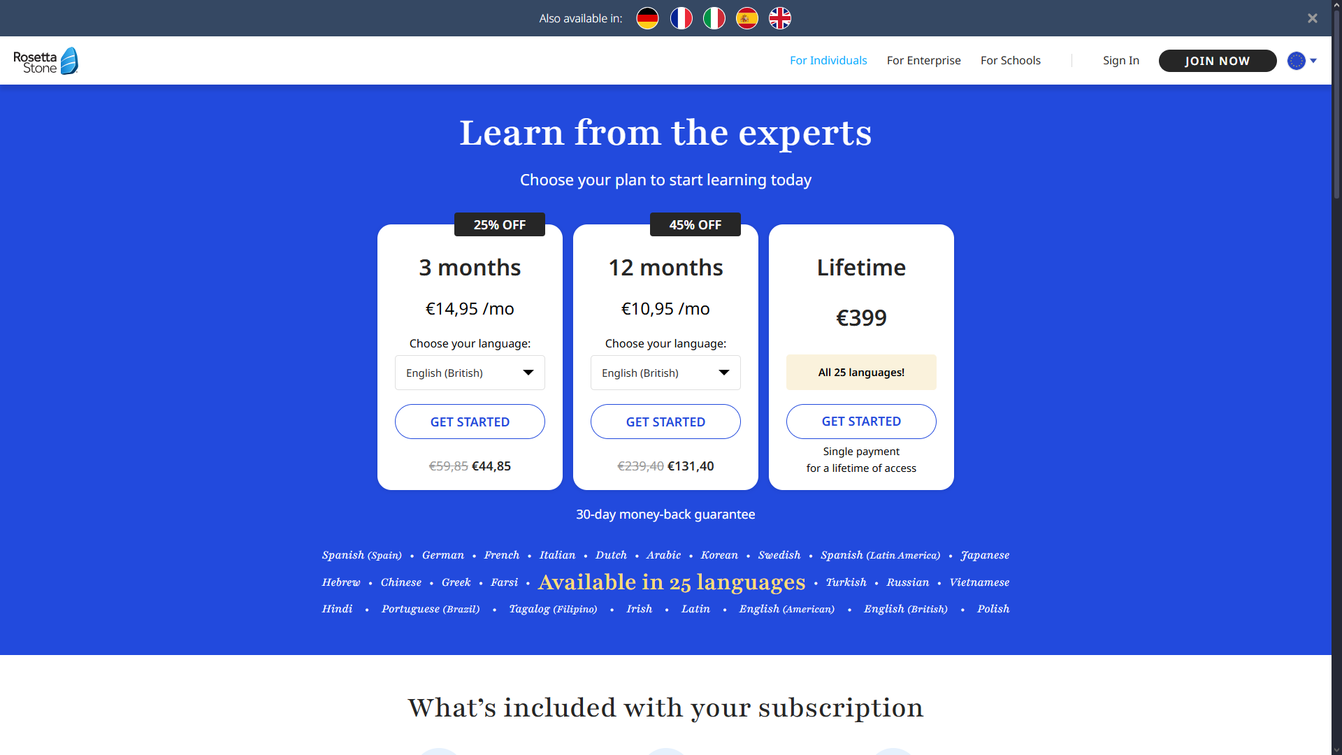 Rosetta Stone’un sunduklarının aksine, bu online platformda ayda sınırsız ders alacak, küçük gruplarla çalışacak ve uygun olduğunuz saatlere göre geniş ders saatleri yelpazesinden faydalanabileceksiniz.