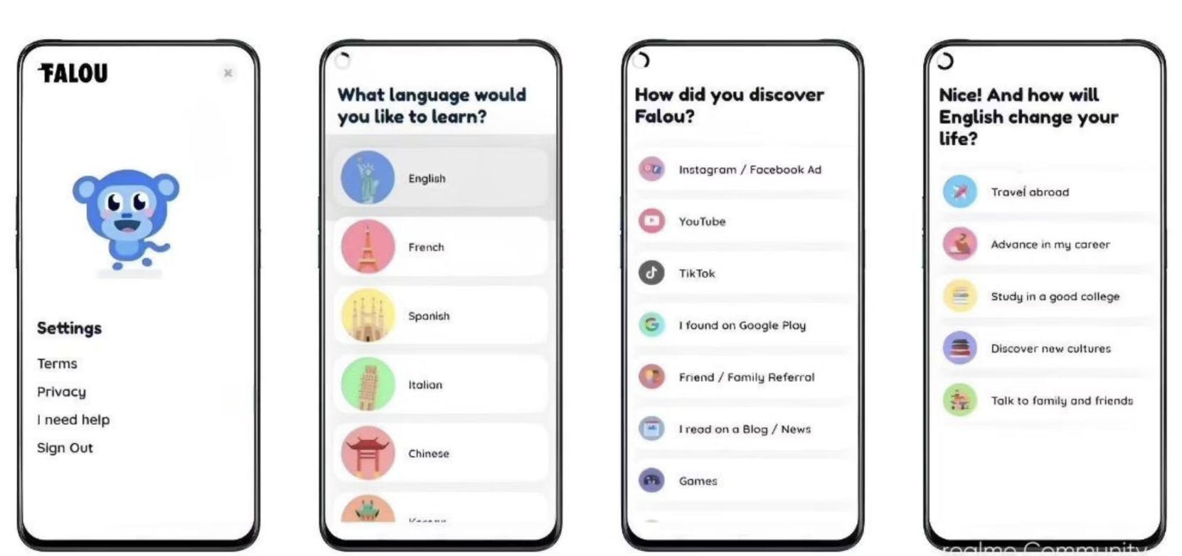 Falou uygulaması, İngilizce de dahil olmak üzere 21 farklı dil içeren bir sisteme sahiptir. Amacı, kullanıcılara telaffuzlarını ve yazılarının kalitesini geliştirebilmeleri için dinamik bir şekilde öğretmektir.